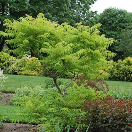 What color and what an easy plant to grow!! This selection of Staghorn Sumac is going to take everything you think about Sumac and throw it out the window! Big foliage fronds emerge chartreuse in the early spring and mature to bright, non-burning yellow, providing an eye opening contrast against pinkish colored stems. In fall the color morphs again into a blazing shade of scarlet that you can see for miles! Remember, all you sumac-a-phobes, this is a non-poisonous plant that thrives in poor, well-drained soil and full sun.