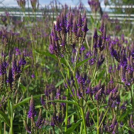 Tall, slender stems hold up 5 to 6 inch spikes of the most beautiful, lavender blue, flowers that bloom for several months! Some say the flower spikes are reminiscent of candelabras. The flowers attract butterflies and it is a host plant for the Common Buckeye butterfly. Don’t cut them back before spring because Cardinals, Sparrows and Juncos enjoy eating the seed. This is an easy perennial to grow in bright sun with moist soil. It looks especially nice in rain gardens or along a ponds edge. Amazingly, blue vervain is native to every state in the U.S.